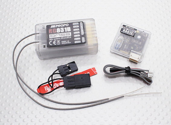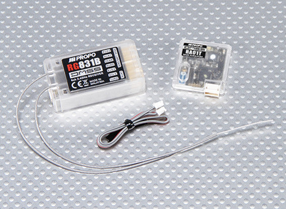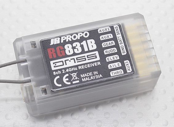 JR RG831B 8-Channel Full Range 2.4GHz DMSS Receiver with telemetry. The RG831B is designed for full range flight featuring telemetry, a coaxial antenna and a remote antenna to ensure a rock solid signal in any orientation.